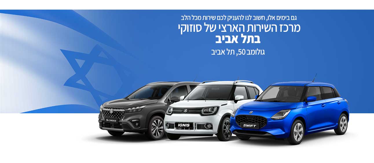 לקוח יקר, על מנת להעניק לך חווית שירות מקיפה וכוללת כלקוח פרימיום, אנו מזמינים אותך למרכז השירות הארצי שבתל אביב המשמש דוגמא ומופת למרכזי שירות בארץ ומרכז את מרבית הפעילות של רכבי סוזוקי באיזור תל אביב. צוות המרכז מונה 18 עובדים, העוברים מערך של הכשרות טכנולוגיות על מנת לעמוד בחזית הידע, ולהעניק ללקוחותינו את השירות המקצועי והטוב ביותר.